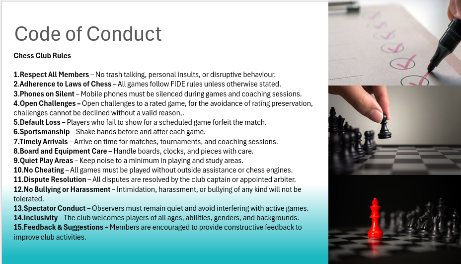 All standard chess equipment, including boards, pieces, and clocks, is provided by the club. Members are also welcome to bring their own equipment if they prefer.