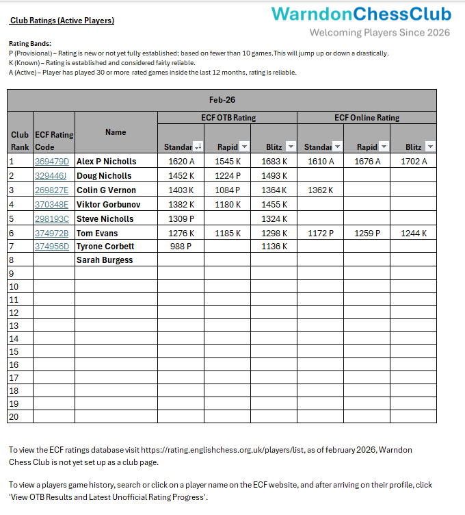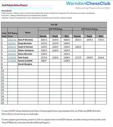 Our club maintains an internal ratings list for all members. These ratings are updated regularly based on rated games played during club nights, internal competitions, and league matches. You can check your current rating and compare it with other members to track your development over time. Sourced from the English Chess Federation Ratings Database.